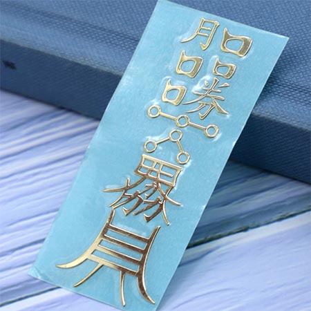 金屬貼符種類比較多,有發財符,佛字,萬字,賭勝符,護身符,六字真言等都可根據客戶的需要尺寸及樣式效果顏色定制生產。